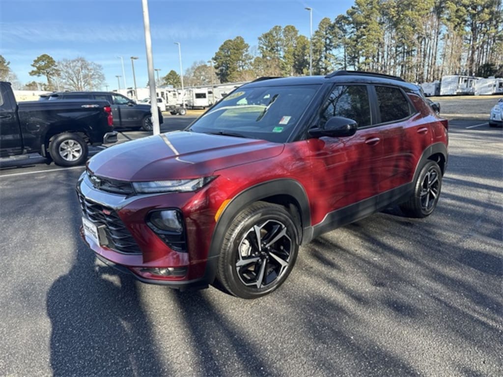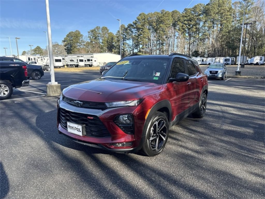 Certified. Crimson Metallic 2022 Chevrolet TrailBlazer RS FWD CVT 1.3L Ecotec Turbo DOHC SIDI w/VVT Ford Blue Advantage: Blue Certified Certified, Heated Steering Wheel, Preferred Equipment Group 1RS, 2-Way Power Driver Lumbar Seat Adjuster, 4-Way Manual Front Passenger Seat Adjuster, 4-Wheel Disc Brakes, 5.45 Axle Ratio, 6 Speakers, 6-Speaker Audio System Feature, 8-Way Power Driver Seat Adjuster, ABS brakes, Air Conditioning, Alloy wheels, AM/FM radio: SiriusXM, Auto High-beam Headlights, Brake assist, Bumpers: body-color, Cloth w/Leatherette Seat Trim, Compass, Delay-off headlights, Driver door bin, Driver vanity mirror, Dual front impact airbags, Dual front side impact airbags, Electronic Stability Control, Emergency communication system: OnStar and Chevrolet connected services capable, Exterior Parking Camera Rear, Flat-Folding Front Passenger Seatback, Front anti-roll bar, Front Bucket Seats, Front Center Armrest, Front fog lights, Front License Plate Bracket, Front reading lights, Front wheel independent suspension, Fully automatic headlights, Heated door mirrors, Heated Driver & Front Passenger Seats, Heated front seats, Heated steering wheel, Illuminated entry, Knee airbag, Leather Shift Knob, Leather steering wheel, Low tire pressure warning, Mosaic Black Metallic Two-Tone Roof, Not Equipped w/Driver & Fr Passenger Heated Seats, Occupant sensing airbag, Overhead airbag, Overhead console, Panic alarm, Passenger door bin, Passenger vanity mirror, Power door mirrors, Power driver seat, Power steering, Power windows, Radio data system, Radio: Chevrolet Infotainment 3 System, Rear seat center armrest, Rear side impact airbag, Rear window defroster, Rear window wiper, Remote keyless entry, Ride & Handling Suspension, Roof rack: rails only, Security system, SiriusXM Radio, Speed control, Split folding rear seat, Spoiler, Steering wheel mounted audio controls, Tachometer, Telescoping steering wheel, Tilt steering wheel, Traction control, Trip computer, Variably intermittent wipers, Wheels: 18" High Gloss Black Machined Aluminum, Wireless Apple CarPlay/Android Auto, **LOCAL TRADE**, **ONE OWNER**, Heated Steering Wheel, Preferred Equipment Group 1RS.