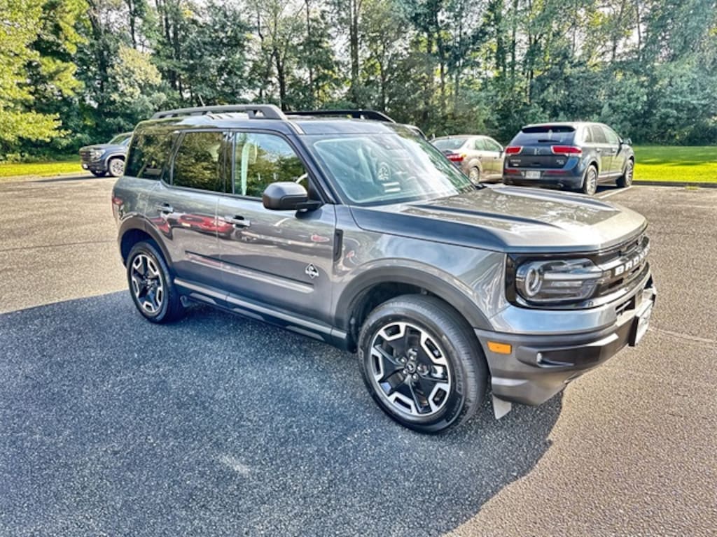 Certified. Carbonized Gray Metallic 2024 Ford Bronco Sport Outer Banks 4WD 8-Speed Automatic 1.5L EcoBoost Ford Gold Certified Certified, Equipment Group 300A, Evasive Steering Assist, Ford Co-Pilot360 Assist+, HD Radio, Intelligent Adaptive Cruise Control w/Stop & Go, Tech Package, Universal Garage Door Opener (UGDO), Voice-Activated Touchscreen Navigation System, Wireless Charging Pad, 3.80 Axle Ratio, 4-Wheel Disc Brakes, 6 Speakers, ABS brakes, Air Conditioning, Alloy wheels, AM/FM radio: SiriusXM, AM/FM Stereo, Auto High-beam Headlights, Auto-dimming Rear-View mirror, Automatic temperature control, Brake assist, Compass, Delay-off headlights, Driver door bin, Driver vanity mirror, Dual front impact airbags, Dual front side impact airbags, Electronic Stability Control, Emergency communication system: SYNC 3 911 Assist, Four wheel independent suspension, Front anti-roll bar, Front Bucket Seats, Front Center Armrest, Front dual zone A/C, Front fog lights, Front License Plate Bracket, Front reading lights, Fully automatic headlights, Heated door mirrors, Heated front seats, Heated steering wheel, Illuminated entry, Knee airbag, Low tire pressure warning, Memory seat, Occupant sensing airbag, Outside temperature display, Overhead airbag, Overhead console, Panic alarm, Passenger door bin, Passenger vanity mirror, Power door mirrors, Power driver seat, Power passenger seat, Power steering, Power windows, Premium-Trimmed Heated Sport Contour Bucket Seats, Radio data system, Rain sensing wipers, Rear anti-roll bar, Rear Parking Sensors, Rear reading lights, Rear seat center armrest, Rear window defroster, Rear window wiper, Remote keyless entry, Security system, SiriusXM, Speed control, Speed-sensing steering, Speed-Sensitive Wipers, Split folding rear seat, Steering wheel mounted audio controls, SYNC 3 Communications & Entertainment System, Tachometer, Telescoping steering wheel, Tilt steering wheel, Traction control, Trip computer, Variably intermittent wipers, Wheels: 18" Ebony Black-Painted Aluminum, **LOCAL TRADE**, **ONE OWNER**, Equipment Group 300A, Evasive Steering Assist, Ford Co-Pilot360 Assist+, HD Radio, Intelligent Adaptive Cruise Control w/Stop & Go, Tech Package, Universal Garage Door Opener (UGDO), Voice-Activated Touchscreen Navigation System, Wireless Charging Pad.