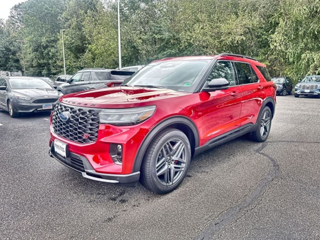 Rapid Red Metallic Tinted Clearcoat 2025 Ford Explorer ST 4WD 10-Speed Automatic 3.0L EcoBoost V6 4WD, 10 Speakers, 3.58 Non-Limited Slip Rear Axle, 3rd row seats: bench, 4-Wheel Disc Brakes, ABS brakes, Air Conditioning, Alloy wheels, AM/FM radio: SiriusXM with 360L, Apple CarPlay/Android Auto, Auto High-beam Headlights, Auto-dimming door mirrors, Auto-dimming Rear-View mirror, Automatic temperature control, B&O Sound System by Bang & Olufsen, Brake assist, Bumpers: body-color, Compass, Delay-off headlights, Driver door bin, Driver vanity mirror, Dual front impact airbags, Dual front side impact airbags, Electronic Stability Control, Emergency communication system: 911 Assist, Equipment Group 400A Standard Package, Exterior Parking Camera Rear, Ford BlueCruise Equipped (1-Year Plan), Four wheel independent suspension, Front anti-roll bar, Front Bucket Seats, Front Center Armrest, Front dual zone A/C, Front fog lights, Front License Plate Bracket, Front reading lights, Fully automatic headlights, Garage door transmitter, Heated door mirrors, Heated front seats, Heated rear seats, Heated steering wheel, Heated/Ventilated Miko Sport Captain's Chairs, Illuminated entry, Knee airbag, Leather steering wheel, Low tire pressure warning, Memory seat, Multicontour Seats w/Front Active Motion, Navigation System, Occupant sensing airbag, Outside temperature display, Overhead airbag, Overhead console, Panic alarm, Panoramic Vista Roof w/Power Shade, Passenger door bin, Passenger vanity mirror, Power door mirrors, Power driver seat, Power Liftgate, Power passenger seat, Power steering, Power windows, Radio: B&O Sound System by Bang & Olufsen, Rain sensing wipers, Rear air conditioning, Rear anti-roll bar, Rear reading lights, Rear window defroster, Rear window wiper, Remote keyless entry, SecuriCode Keyless Entry Keypad, Security system, Speed control, Speed-sensing steering, Speed-Sensitive Wipers, Split folding rear seat, Spoiler, Sport steering wheel, Steering wheel mounted audio controls, Sun and Sound Package, Tachometer, Telescoping steering wheel, Tilt steering wheel, Traction control, Trip computer, Turn signal indicator mirrors, Variably intermittent wipers, Ventilated front seats, Wheels: 21" Magnetite-Painted Aluminum, 4WD.